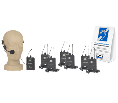 The Tour Guide Package includes six Assistive Listening belt pack receivers, one wireless belt pack transmitter, one headband mic, and a sturdy cardboard carrying case.