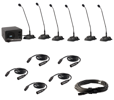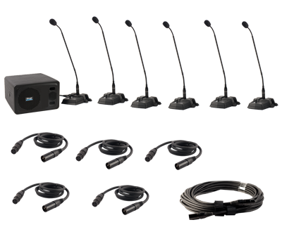 This CouncilMAN Conference System Package includes AN-100CM+, one CHM-100, five DEL-100, five EX-4M, one EX-25M, and a sturdy cardboard carrying case.